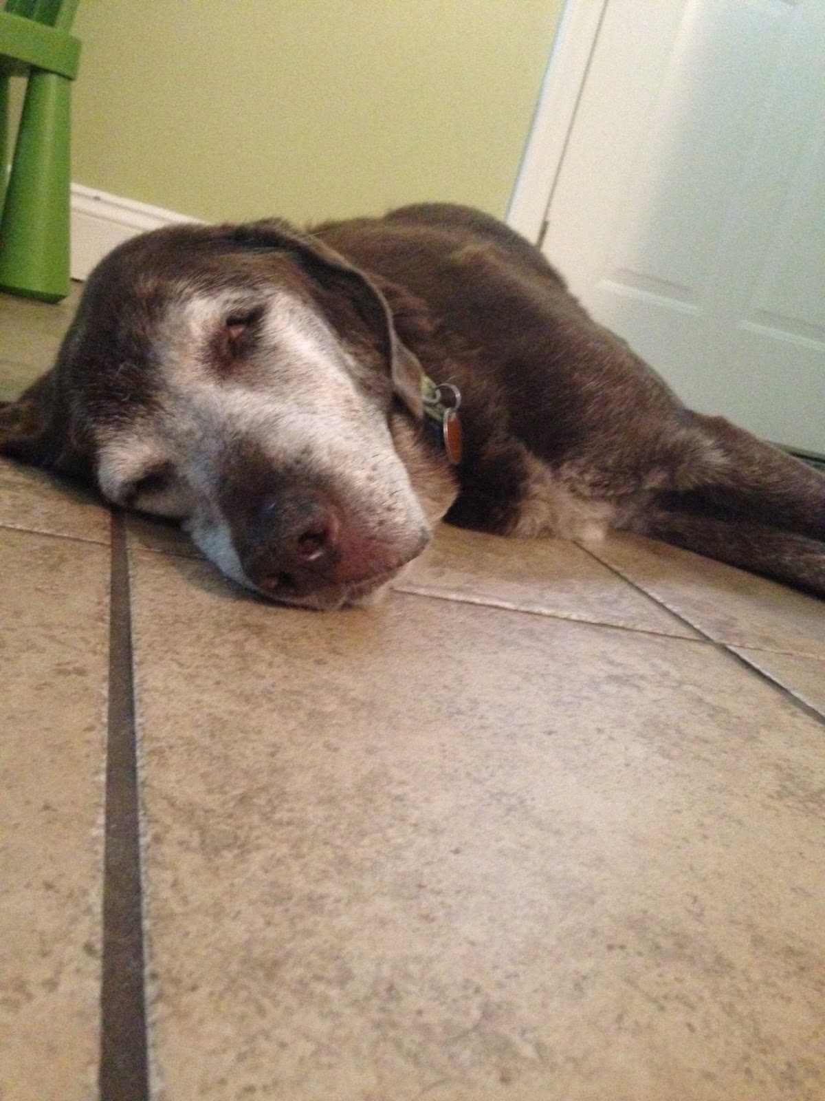 He’s old. He has a breathing problem (he pants a lot, and I’m pretty sure it’s not just because it’s hot most of the time), is going blind and deaf, and has terrible hips. The hips especially have taken a swift downturn recently, where when he’s walking on the tile (seen here with him sleeping), his hind legs will just slip out from under him and plop him on the floor. He’s pretty chill about it. He just sort of sighs and says Well, I guess I’ll lie here then.