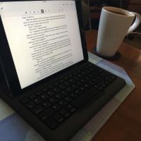Also, check out the sweet setup I do most of my quick morning writing on (using Google Docs): iPad with a keyboard case. Works best with tiny hands, but is better than booting my laptop in the morning before a busy day.